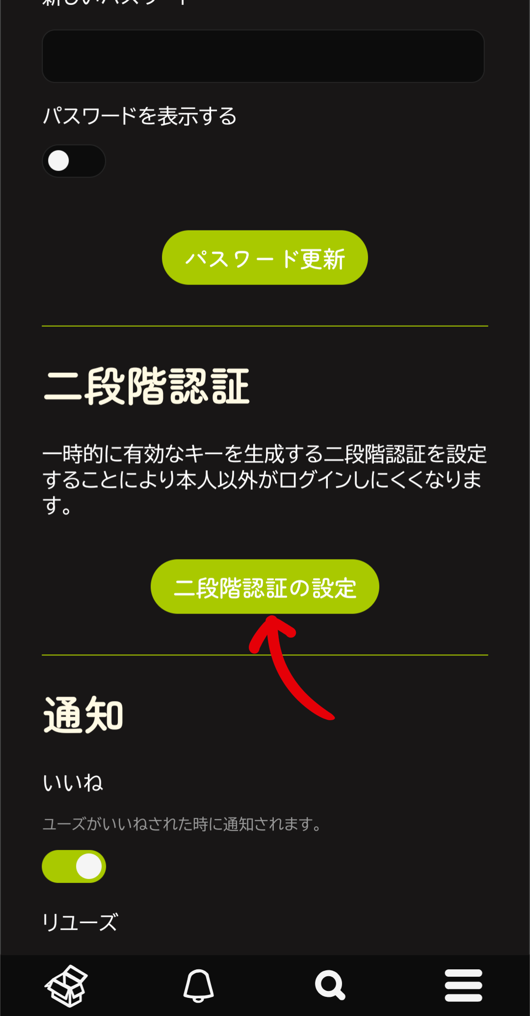 設定画面で少し下にスクロールすると「二段階認証」という欄があります!