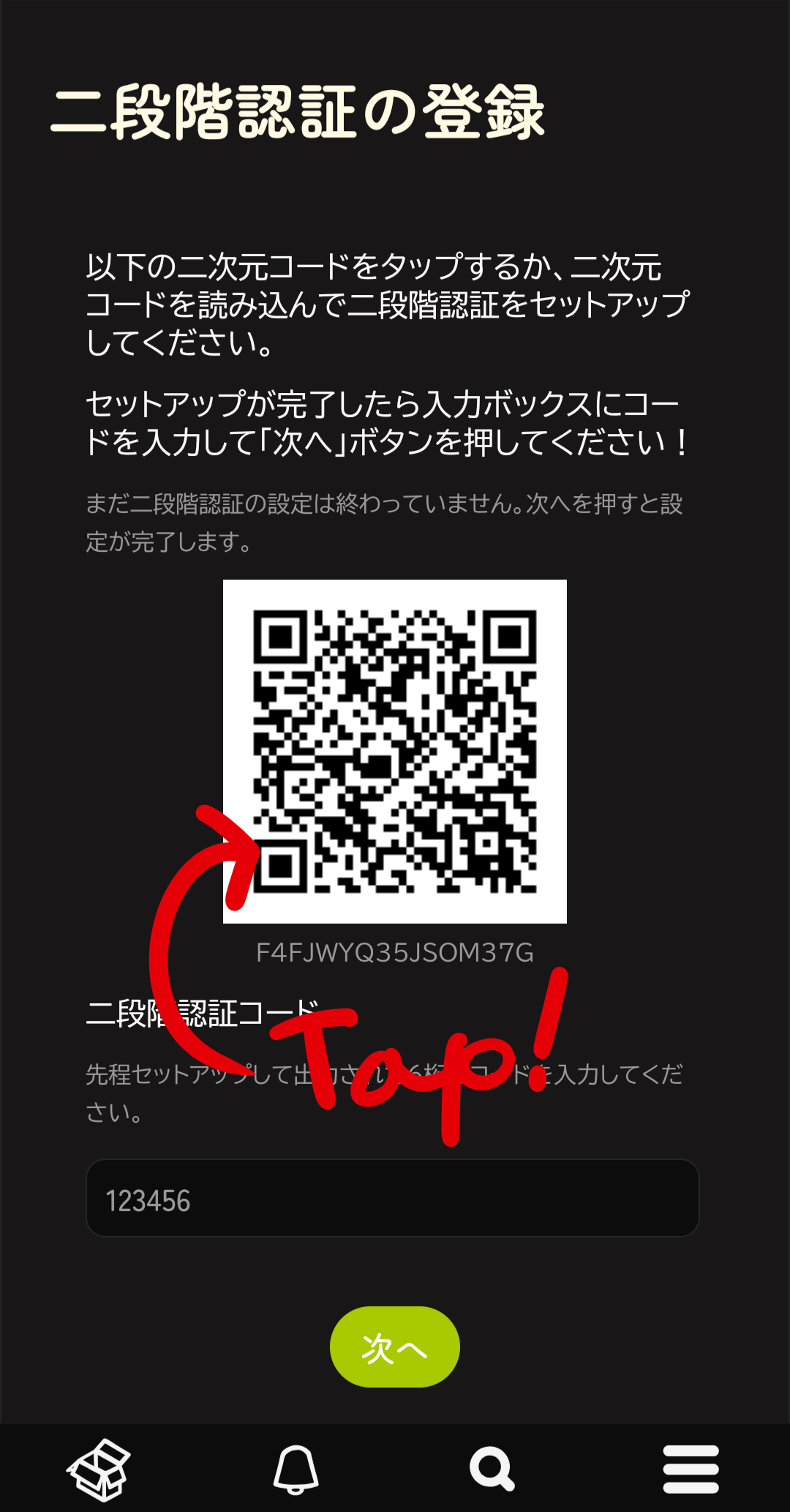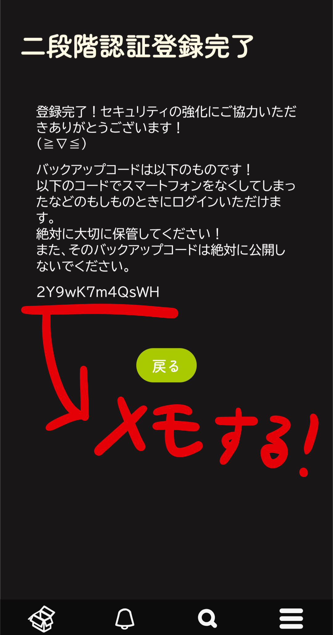 「二段階認証登録完了」というページに移動したら、画面中央あたりの12文字の英数字をメモするなり、絶対になくさない方法で保管してください!絶対に他の人に見せないでください!!!