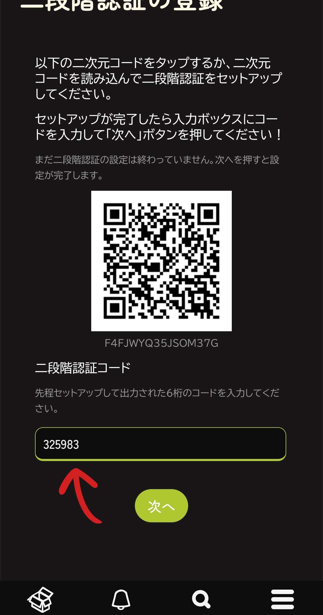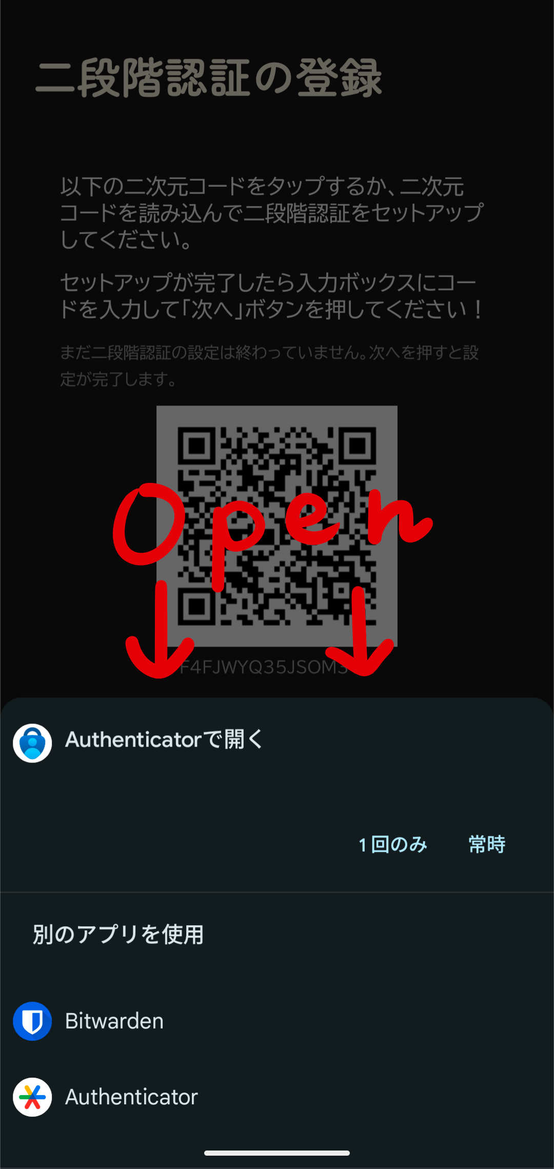 二次元コードが読み取れない場合、二次元コードの下の文字列(画像では"F4FJWYQ35JSOM376")から設定も可能です。(少し難しくなります。ここでは解説しません。)